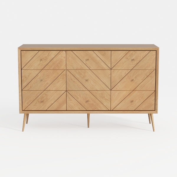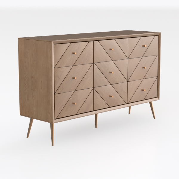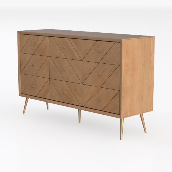 Inspired by Scandinavian geometric patterns, this piece blends clean lines with warm oak texture. Smooth surfaces highlight the light wood’s natural grain, creating an airy, minimalist vibe. Pair with marble coffee tables and brushed brass accents for modern living rooms, offering spacious drawers and slender metal legs for stable, organized storage.