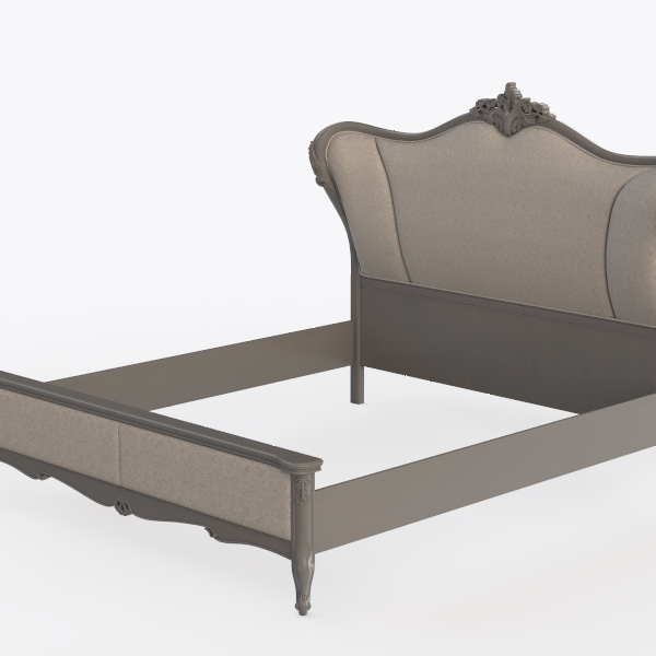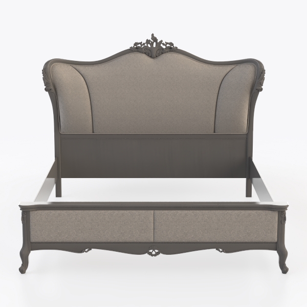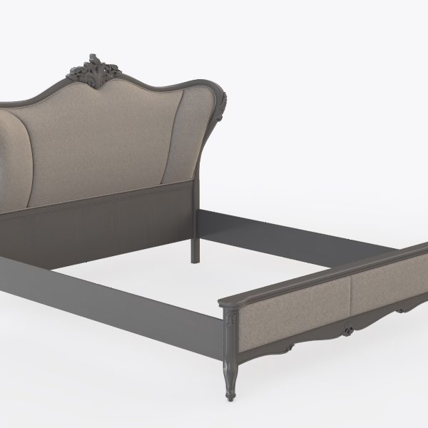 Inspired by classic European elegance, this bed merges a soft, light gray upholstered headboard with intricate carved wooden trim. Its dark wooden frame, with delicate scrollwork, exudes timeless charm. The sturdy structure includes hidden drawers for storage, while the plush fabric and curved headboard offer exceptional comfort, perfect for a refined, vintage-inspired bedroom with lace curtains and crystal lighting.