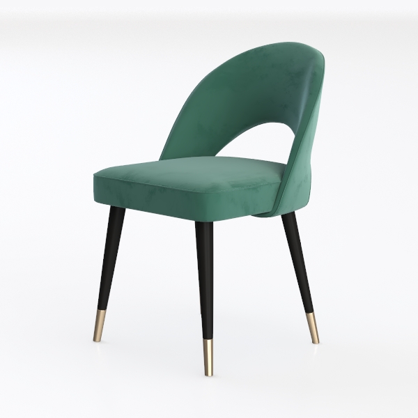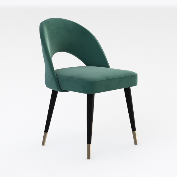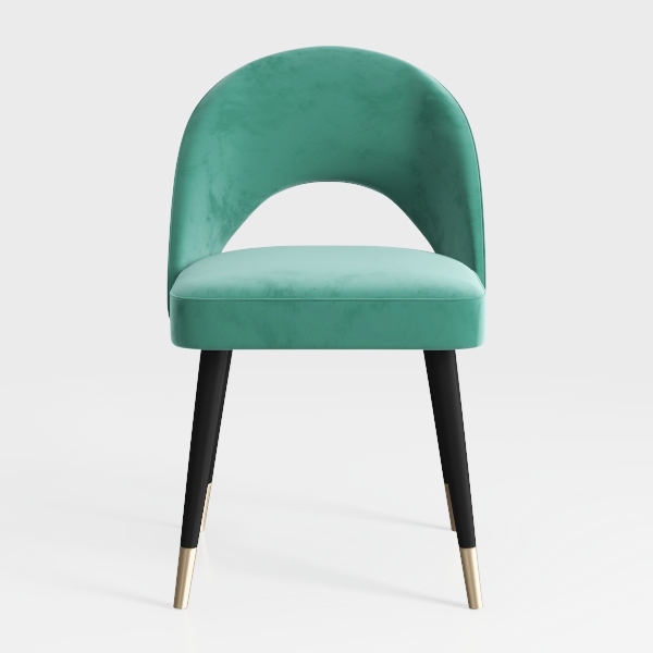 Inspired by the soft flow of organic curves, this velvet chair features a rich teal upholstery with a velvety, sumptuously smooth texture. Its sleek black legs, capped with delicate gold tips, add a modern-luxe touch, perfect for a dining room or living space paired with marble tables and metallic accents. The ergonomic curved back and plush seat ensure exceptional comfort, blending style and functionality beautifully.