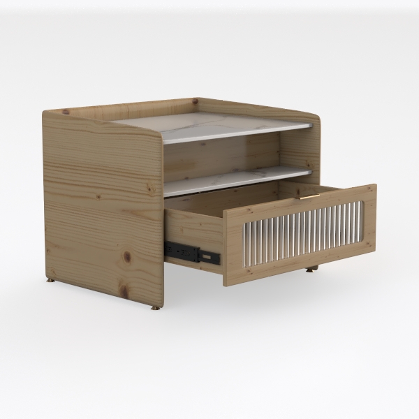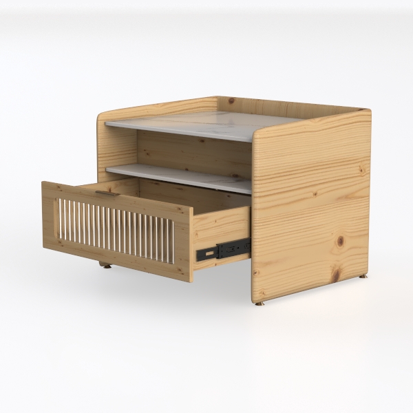 Inspired by nature's serenity, this wooden storage unit blends warm, grainy wood with sleek marble shelves, creating a soft, minimalist vibe. Its light tone pairs beautifully with Scandinavian or Zen spaces, complemented by soft textiles. The lower drawer offers hidden storage, while open shelves display decor, balancing style and practicality seamlessly.