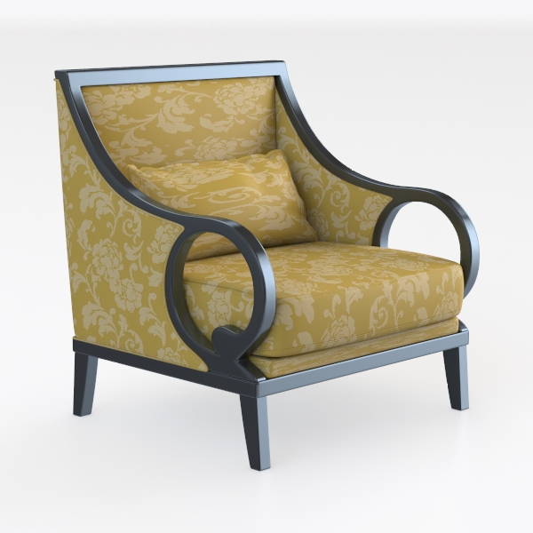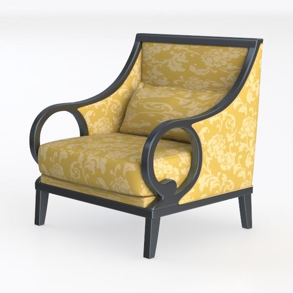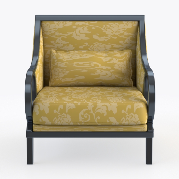 This elegant armchair draws inspiration from the timeless charm of 18th-century European decorative traditions, reinterpreting classic floral motifs through a modern design lens. Its warm canary-yellow upholstery, adorned with intricate, flowing floral patterns, exudes a sense of refined warmth, while the soft, textured fabric promises a plush, inviting touch—ideal for lingering in comfort. The sleek black frame, with its clean, angular lines, creates a striking contrast to the opulent upholstery, balancing ornate detail with contemporary simplicity, making the piece feel both historically rooted and fresh.