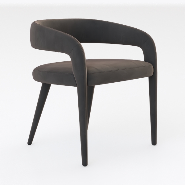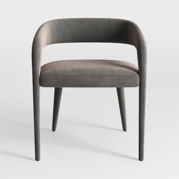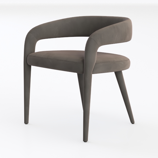 Inspired by organic curves and minimalist aesthetics, this chair features soft, velvety upholstery in muted gray, smooth to the touch, with a sleek, matte finish. Its slender, tapering legs add lightness, ideal for a modern dining room or cozy living nook, pairing beautifully with wooden tables and metallic accents. Generous seat depth and contoured backrest ensure exceptional comfort, blending style and practicality seamlessly.