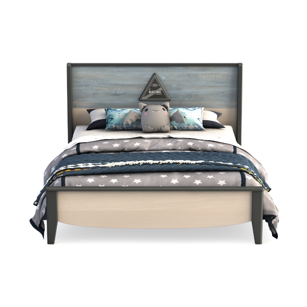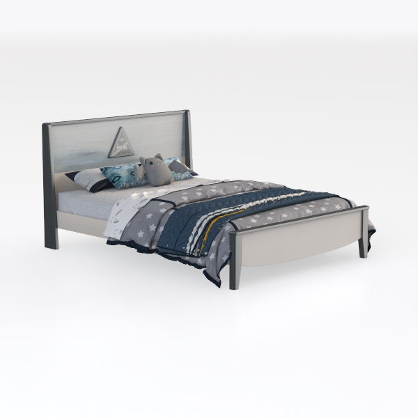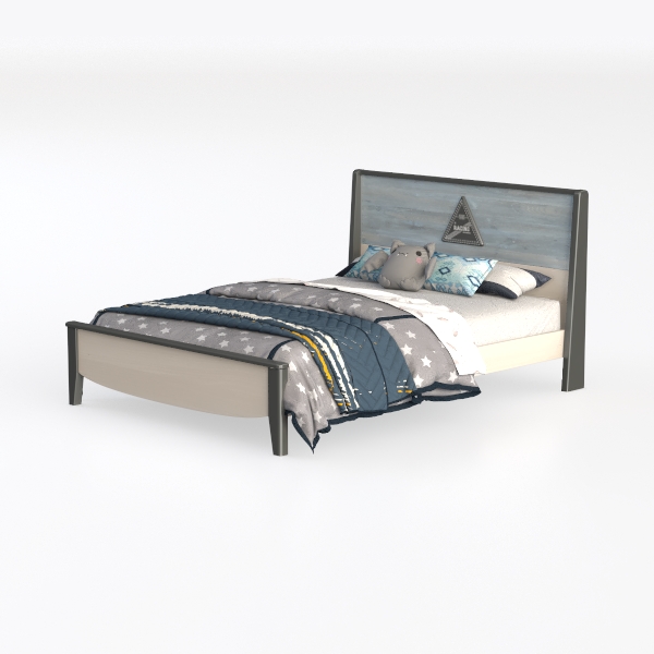 Inspired by nature and geometric details, this bed features a weathered blue-gray headboard with a triangular accent. Warm wood grain invites gentle touches, while soft star-patterned linens add cozy comfort. Light frame and layered bedding create a balanced, playful look—perfect for a kid’s room, pairing with marble nightstands and plush pillows. Sturdy, durable, and sweet for restful sleep.