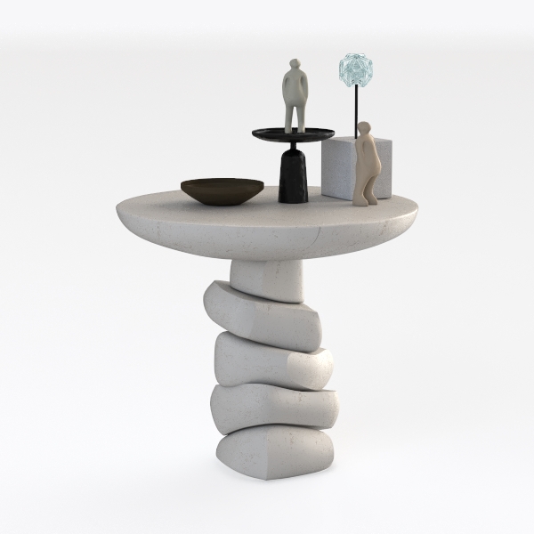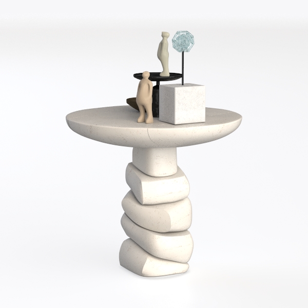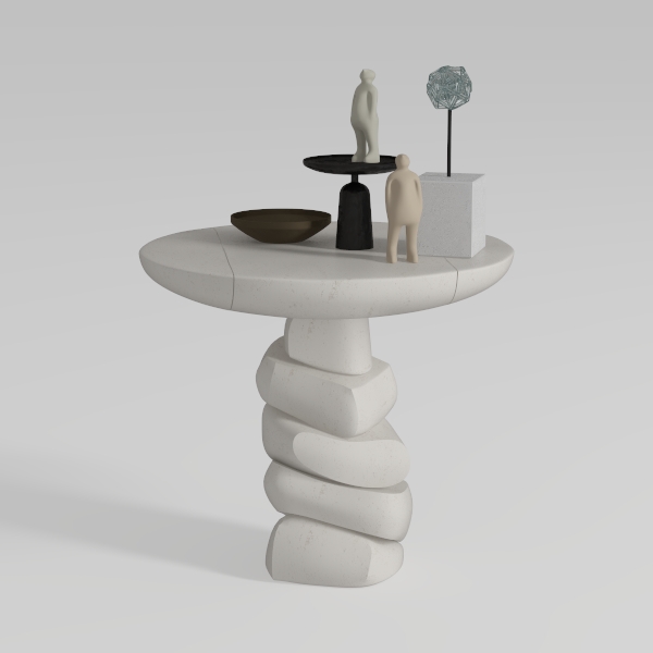 Inspired by natural stone formations, with a stacked, sculptural base, this white side table features a smooth, matte surface and soft organic curves. Its tactile blend of modern minimalism and earthy warmth suits a contemporary living room, pairing beautifully with marble accents and metallic decor. The circular top holds decor, while the balanced base ensures stability, merging functionality with artisanal charm.