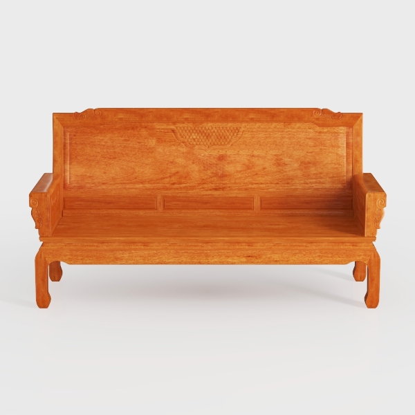 This elegant wooden bench draws inspiration from traditional Asian furniture craftsmanship, blending clean lines with intricate detailing. Its warm honey-brown wood showcases rich, visible grain patterns, evoking a sense of natural warmth and heritage. The design emphasizes symmetry, with subtly curved armrests adorned by delicate floral carvings that add depth without overwhelming the piece, while the sturdy, tapered legs provide a stable base.
