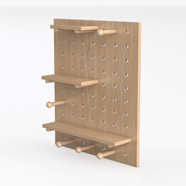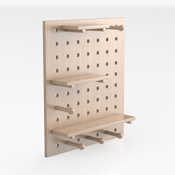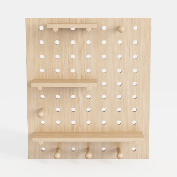 Inspired by minimalist organization, this wooden pegboard features a warm natural wood texture with smooth surfaces, creating a clean, organized look. Ideal for modern minimalist spaces, it blends functionality with subtle charm, boasting three horizontal shelves and integrated pegs for flexible storage of daily essentials, keeping areas clutter-free.