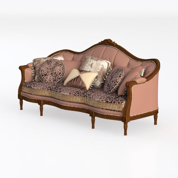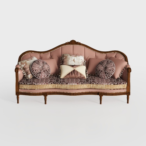 Exuding timeless charm, this elegant sofa draws inspiration from 18th-century European classical furniture, reimagined with modern sensibilities. Its curved silhouette and intricate carved wooden frame reflect the opulence of traditional craftsmanship, while soft, muted pink upholstery infuses a contemporary warmth.