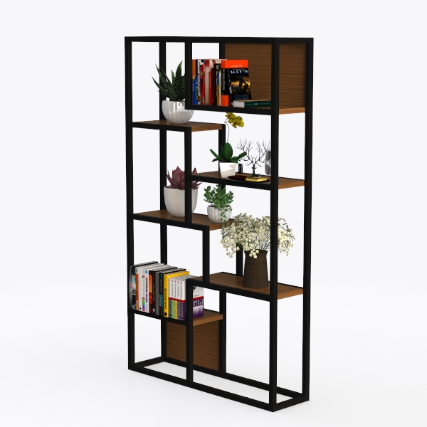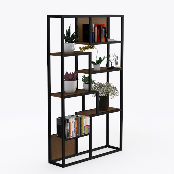 Blending organic elements with geometric precision, this shelving unit draws inspiration from nature’s rhythm and modern minimalism. Its black metal frame adds sleek industrial edge, while warm wooden shelves bring cozy natural texture—visual balance from contrasting materials. Ideal for modern/Scandinavian living rooms/studies, pair with potted plants, colorful books, and understated decor for vibrant, uncluttered charm. Generous compartments offer ample space for books, greenery, and knick-knacks, merging functionality with aesthetic appeal.