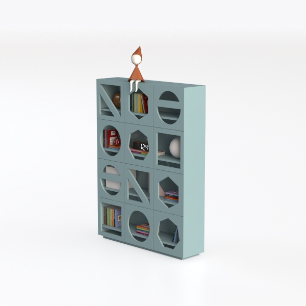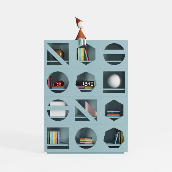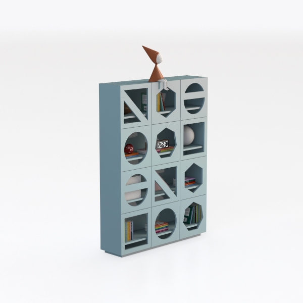 Inspired by geometric diversity, it blends circular, hexagonal, and diamond-shaped compartments for a playful yet structured look. The soft blue hue and clean lines create a light, airy feel, with varied cutouts adding visual interest without heaviness. Ideal for modern minimalist living rooms or study corners, pairing seamlessly with neutral furniture and wooden accents, and its versatile compartments store books, decor, and personal items, balancing aesthetics and practicality.