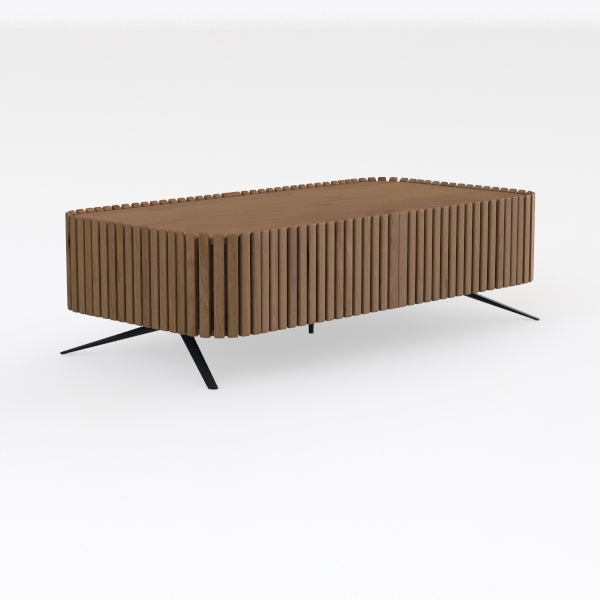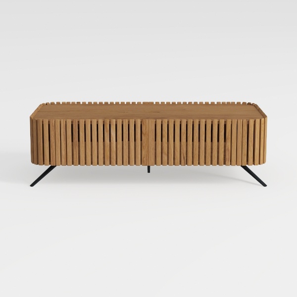 Crafted with natural wood and geometric lines, inspired by minimalist Scandinavian design. Its warm, smooth surface with subtle wood grain texture offers a tactile contrast to the sleek black metal legs. Vertical slats create dynamic light and shadow effects, balancing simplicity and depth. Perfect for modern living rooms, it pairs beautifully with neutral sofas and potted plants, while ample storage space and stable legs ensure both style and practicality.
