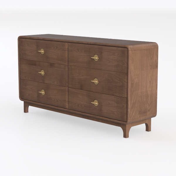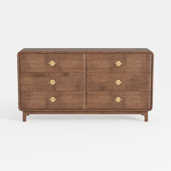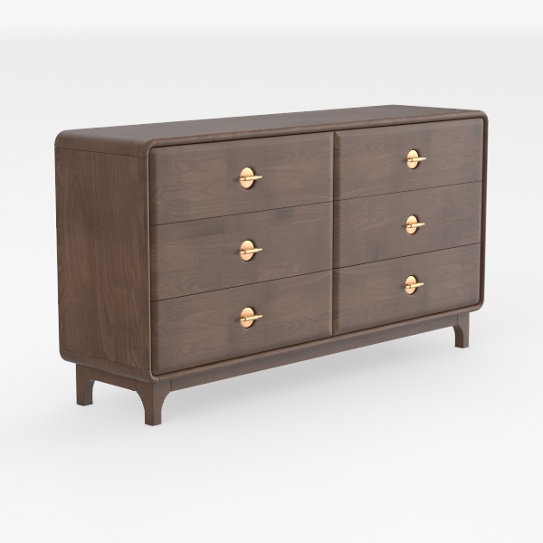 Inspired by natural wood grain and geometric minimalism, this six-drawer cabinet features warm walnut hues and smooth brass handles. Its tactile wooden surface, with rich, soft grain and a matte finish, feels cozy yet refined. Perfect for modern or Scandinavian bedrooms, pair with neutral walls and textiles. Six smooth-gliding drawers offer ample storage, sturdy and functional for daily use.