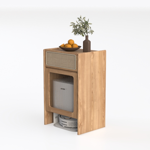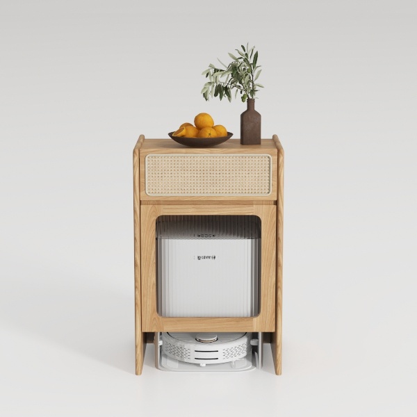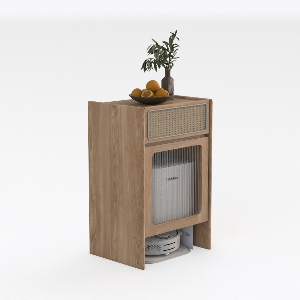Designed to blend natural warmth with practicality, this piece features a light oak frame and woven rattan detailing, offering textural contrast. The smooth, neutral tones create a calm, airy vibe, with a top shelf holding fresh fruits and greenery for life, and a lower hidden compartment for small appliances—ideal for modern minimal or Scandinavian spaces, merging style and utility seamlessly.