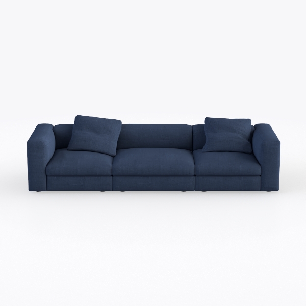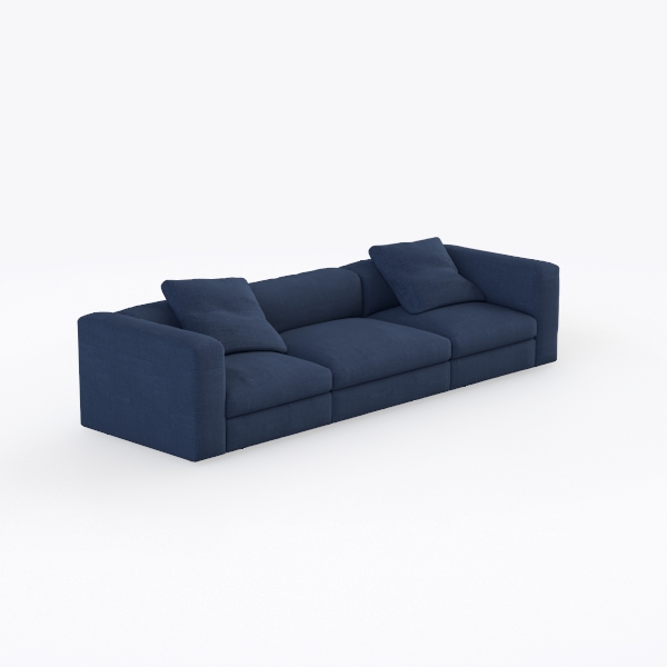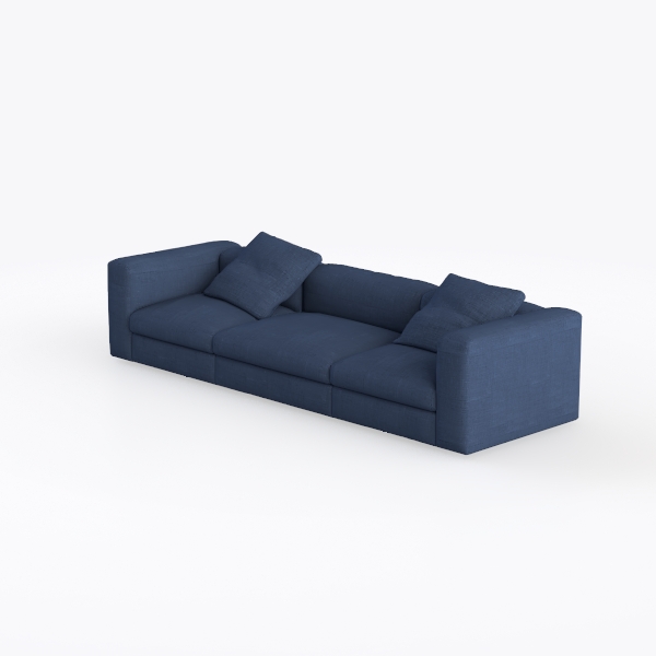 Crafted from a soft, textured linen-like fabric in a deep, oceanic blue, it feels surprisingly sturdy yet inviting to the touch—light enough to keep the space from feeling heavy, yet substantial enough to wrap you in warmth. Its streamlined silhouette, with gently sloped arms and a low, wide profile, creates a sense of calm, while the two plump, matching cushions add a subtle, intentional softness.
