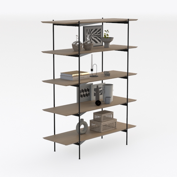 Designed to blend natural warmth with industrial sleekness, this shelving unit features warm, textured wooden shelves and matte black metal frames. Staggered levels and clean lines create visual depth, while sturdy legs ensure stability. Perfect for modern minimalist or Scandinavian spaces, it showcases potted plants, books, and decor, balancing functionality with curated style.