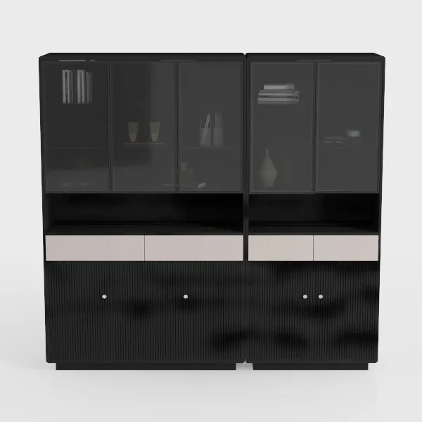 Inspired by urban minimalism, prioritizing function with clean, linear lines. Crafted with smooth matte black surfaces and sleek glass doors, vertical ribbed lower parts add subtle texture, while crisp white drawer fronts create striking contrast, exuding calm sophistication. Ideal for modern minimalist or Scandinavian living rooms, paired with light walls and wooden accents. Spacious compartments—glass-fronted upper shelves for decor, roomy drawers below for hidden storage—balancing display and practical use.