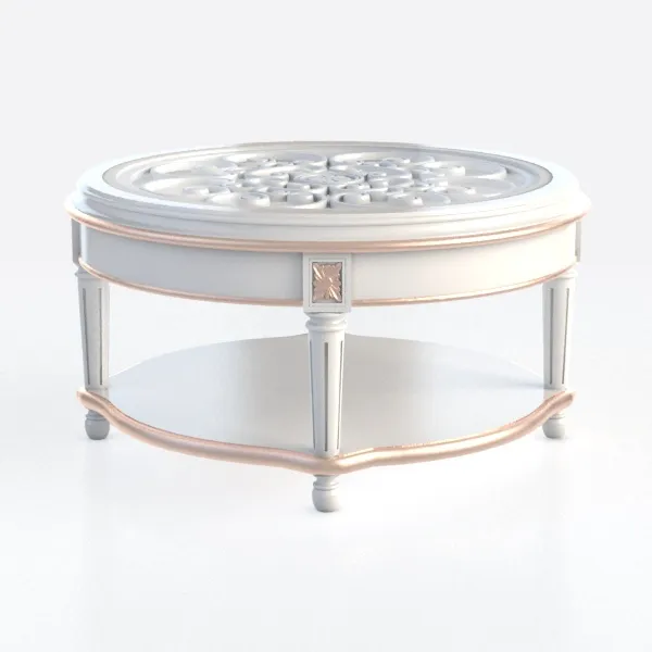 Inspired by timeless European craftsmanship, this elegant coffee table features a smooth white surface with intricate carved patterns, warm metallic accents, and a two-tiered design. Its slender, decorated legs add grace, while the lower shelf offers practical storage. Perfect for a modern classic living room, it pairs beautifully with marble and brass elements to enhance refined ambiance.