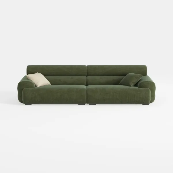 Crafted with a plush corduroy fabric, the surface feels surprisingly soft yet subtly structured, with fine ribbed textures that catch light softly. The silhouette is a masterclass in balanced curves: rounded armrests and a generously deep seat invite relaxation, while the low-profile design keeps the piece feeling open and uncluttered. Two tasteful throw pillows—one in a creamy ivory and another in a textured olive—add layers of comfort and style, enhancing the sofa’s versatile appeal.