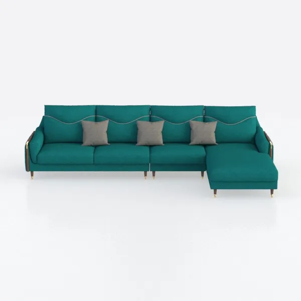 The sleek metallic legs, with their polished finish, elevate the sofa’s visual appeal, balancing the softness of the upholstery with a touch of contemporary glamour. Its L-shape design is both functional and space-efficient, making it ideal for modern minimalist or contemporary living rooms. Pair it with a marble coffee table for a touch of opulence, a geometric-patterned rug to add texture, and a sculptural floor lamp to enhance the cozy ambiance.