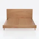 Inspired by Scandinavian minimalism, this bed features warm oak grain with smooth, tactile surfaces and soft, natural tones. Clean lines and a low-profile frame create a serene look. Perfect for modern, Nordic or Japanese bedrooms, pair with linen bedding and woven rugs. The slatted base ensures breathability, while sturdy legs add stability.