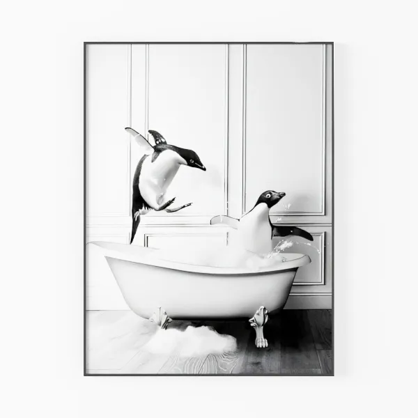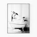 A 3D model of a whimsical giraffe in a bathtub, featuring a vintage tub and a playful, black-and-white aesthetic. It has detailed 3D rendering and is ideal for home wall decor.