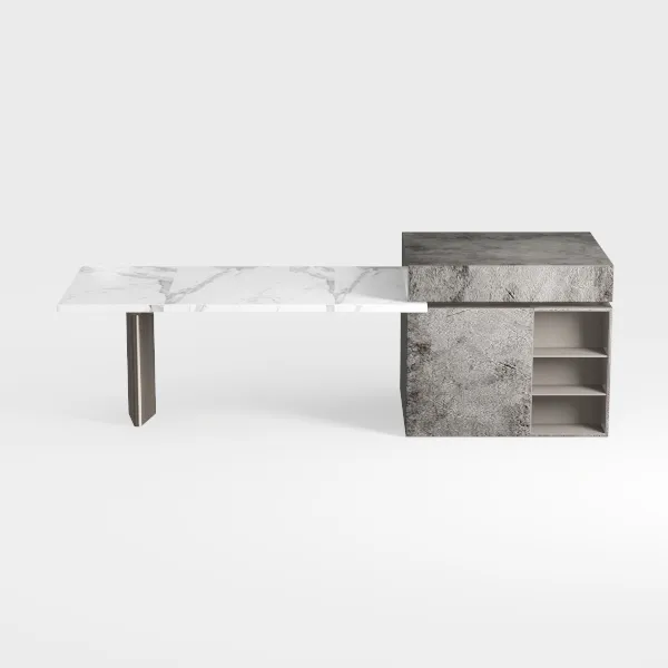 Inspired by the organic yet structured patterns of natural marble, this kitchen island features a smooth, glossy surface with striking gray-white veining, radiating a cool, luxurious vibe. Its geometric, angular design pairs seamlessly with metallic-accented bar stools, perfect for modern minimalist or contemporary luxury spaces. Spacious countertop and ergonomic stools blend style and practicality for casual gatherings or quick meals.