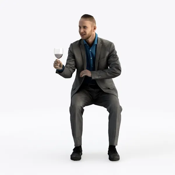 A 3D model of a seated man, featuring a gray suit, blue shirt, and holding a wine glass, with a professional yet relaxed style aesthetic. It has high detail and realistic textures, suitable for business presentations, film/TV, or game characters.