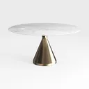 Crafted from geometric minimalism and natural stone patterns, this round table features a smooth, veined marble top with a cool, tactile feel, contrasting beautifully with the warm, polished brass tapering base for striking visual harmony. Ideal for modern-luxe living/dining spaces, it pairs with neutral sofas and metallic accents, ensuring stability and space efficiency for gatherings or daily use.