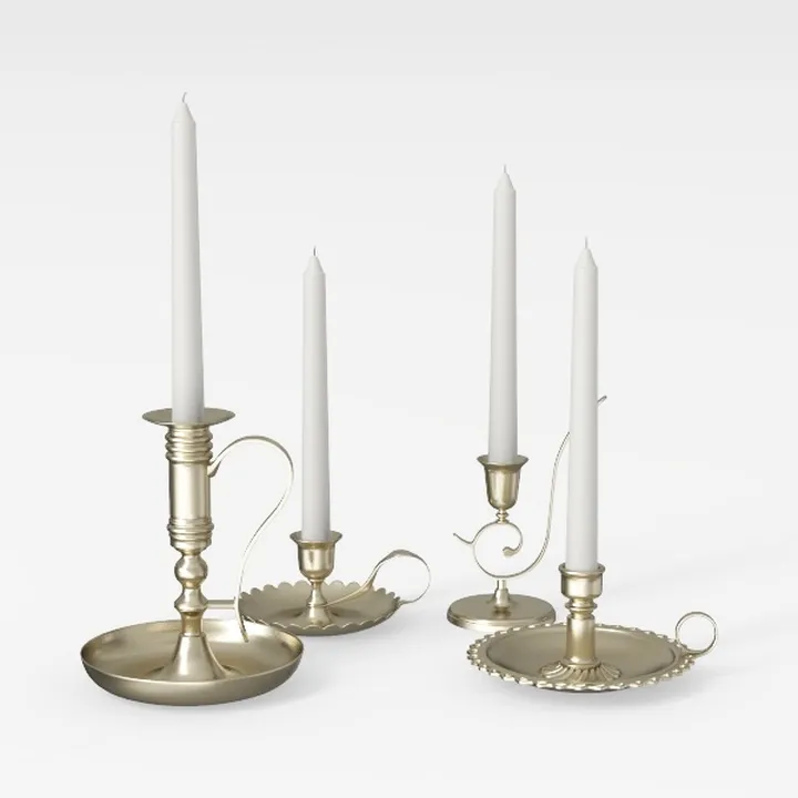 A 3D model of a candlestick, featuring metallic (brass) construction with white candles and a classic, elegant design aesthetic. It has low to medium polygon count and is suitable for home decor, table settings, or festive displays.