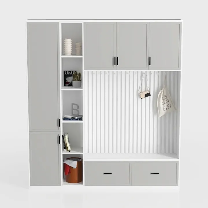 Designed to blend functionality and minimalism, this home storage unit features sleek matte surfaces in soft gray and crisp white, creating a clean, airy vibe with smooth edges for tactile comfort. Ideal for modern entryways or living rooms, it pairs beautifully with potted plants and minimalist decor, boasting closed cabinets, open shelves, a hanging rack, and a built-in bench for ample storage and a cozy sitting spot.