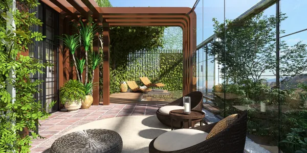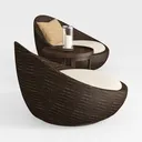 This set of two lounge chairs and a round side table embodies a blend of natural inspiration and modern elegance. Evoking the fluid curves of seashells or smooth river stones, the design feels organic and serene, with soft, rounded edges that invite relaxation. The deep brown woven texture of the chairs boasts a subtle handcrafted quality, each strand creating a rhythmic pattern that catches light gently, while the plush cream upholstery of the seats offers a warm, inviting contrast. Visually, the furniture feels light yet substantial—its undulating silhouette softens any space, making it ideal for creating a calm, cozy atmosphere.