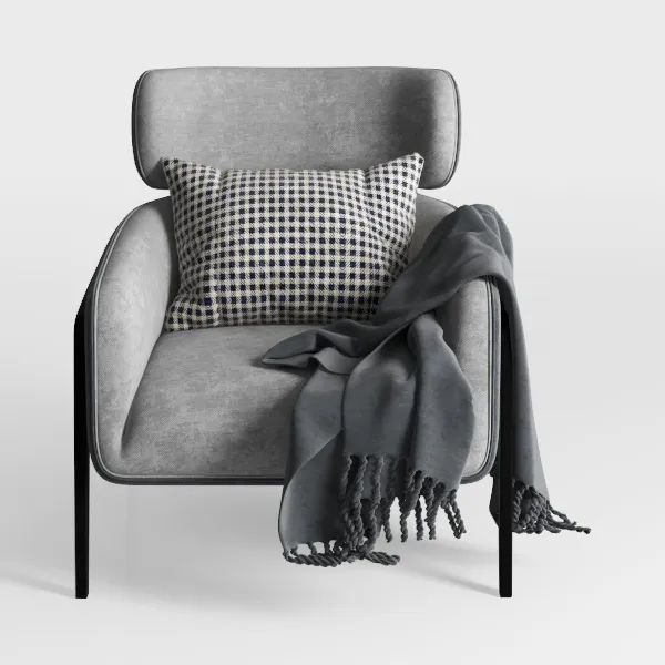 Inspired by minimalist Scandinavian design, this armchair features soft, textured upholstery in muted gray. Clean lines and soft texture create a serene, cozy vibe, complemented by a checkered pillow and tasseled gray throw. Ideal for modern minimalist living rooms, pair it with wooden coffee tables and potted greenery. Plush padding and ergonomic curves offer exceptional comfort, enhancing relaxation.
