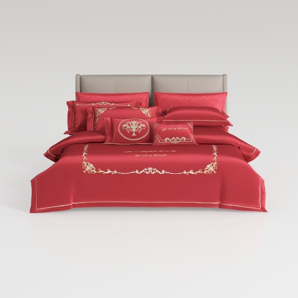 Inspired by the timeless allure of classic opulence and modern coziness, this bedding ensemble centers on a deep, warm red base that radiates comfort and sophistication, accented with delicate gold embroidery. The intricate patterns—featuring symmetrical curves and subtle motifs—blend traditional elegance with contemporary charm, reflecting a thoughtful blend of heritage and modern living.