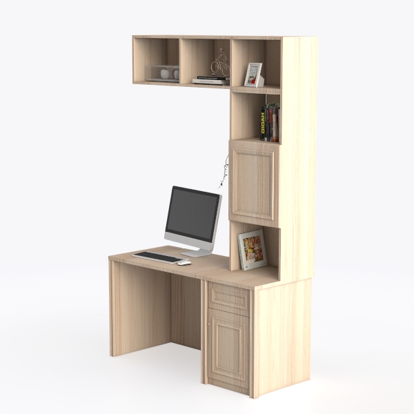 This multifunctional desk and shelving unit draws inspiration from the seamless blend of practicality and natural warmth, born from a desire to maximize space while fostering a serene, organized environment. Crafted with light wood tones, its surface features smooth, visible wood grain that feels warm and tactile to the touch. Clean, streamlined lines and a compact yet functional structure create a visually light and uncluttered appearance, avoiding the heaviness often associated with traditional storage units.