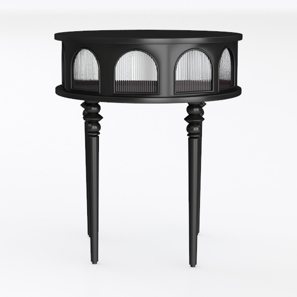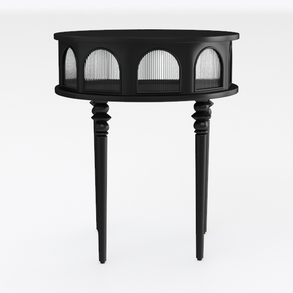 Inspired by architectural motifs, particularly the timeless arches of classical design, this piece merges historical elegance with modern simplicity. Its smooth, matte black surface feels cool yet warm to the touch, with a subtle texture that catches light softly. The tabletop, framed by delicate arched mesh inserts, adds an airy, open feel—translucent enough to avoid heaviness, while the solid black base grounds the design. The slender, turned legs, with their gently bulbous midsections, balance sturdiness and grace, creating a silhouette that feels both stable and visually light.