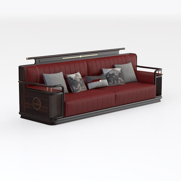 This striking sofa embodies a blend of luxury and modern design, inspired by the elegance of Art Deco aesthetics. The rich crimson upholstery exudes warmth and sophistication, while the sleek lines and subtle detailing provide a contemporary edge. The contrast of the soft fabric against the polished, dark wood trim creates a tactile experience that invites touch and admiration.
