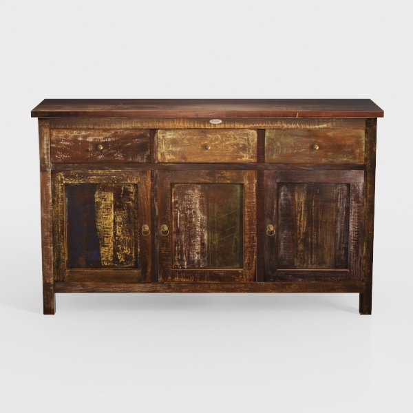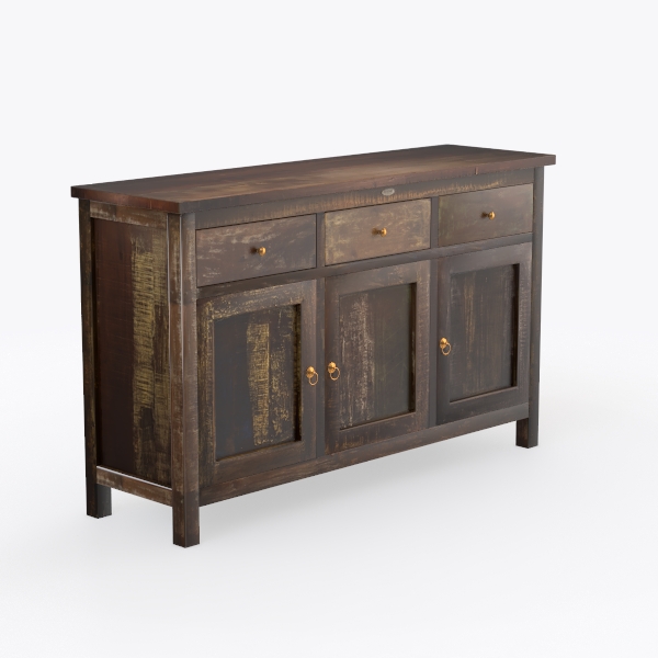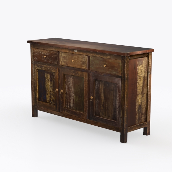 Perfect for a vintage or industrial-style living room, it pairs beautifully with a jute rug, leather sofa, and a metal-framed floor lamp, enhancing both cozy and sophisticated vibes. Functionality shines: three spacious drawers and three cabinet doors offer ample storage for tableware, books, or decor, making it practical without sacrificing style. Each detail, from the brass handles to the varied wood tones, feels like a curated blend of history and purpose, creating a timeless piece for any home.