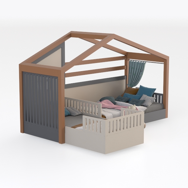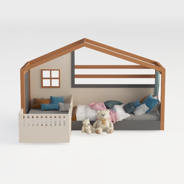 This children’s bedroom set blends playful warmth with practical design, inspired by the comforting image of a cozy home. The wooden frame, with its smooth, sanded surface, feels gentle to the touch—neither too cold nor overly rough, making it safe for little hands to explore. Soft blue and pink cushions add cheerful color, balancing the neutral off-white and light gray walls for a bright, airy vibe. Its house-shaped structure—complete with a sloped roof and window cutout—evokes fairy-tale charm, merging functionality with whimsy.