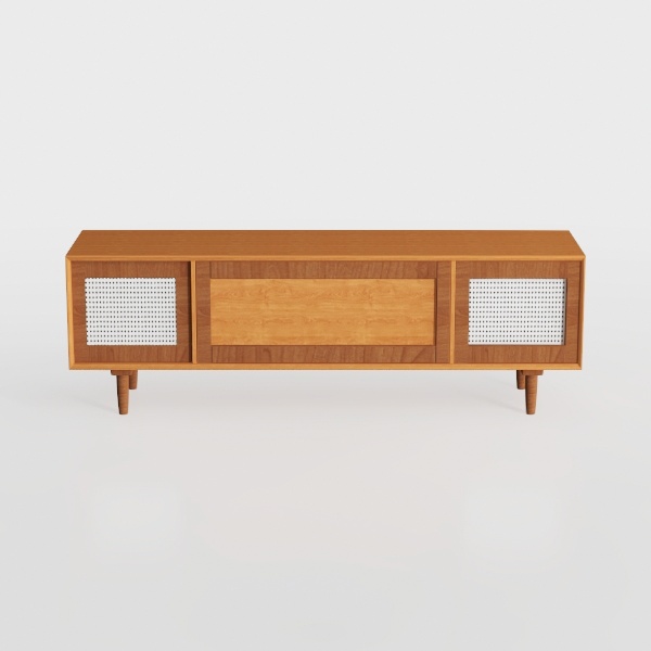 Ideal for a retro-modern or Scandinavian-inspired living room, it pairs beautifully with a plush linen sofa in soft gray, a jute rug, and vintage brass lamp bases, infusing the space with warmth and character. The console’s design is as functional as it is stylish: three distinct sections—central open shelf and two closed cabinets with woven doors—offer ample storage for a TV, media devices, and daily essentials, while the slender, tapered legs keep the piece elevated, avoiding visual bulk and making it perfect for smaller rooms.