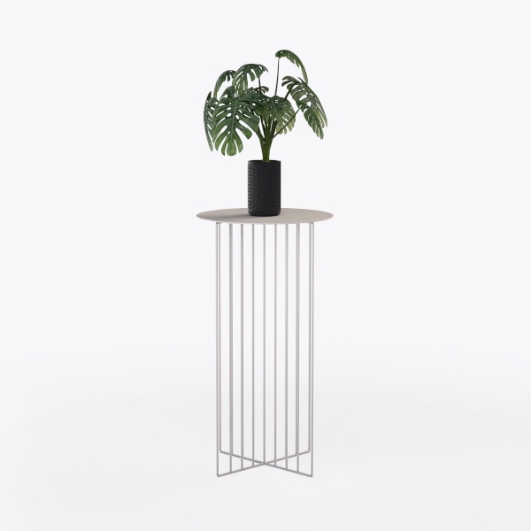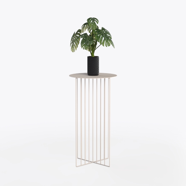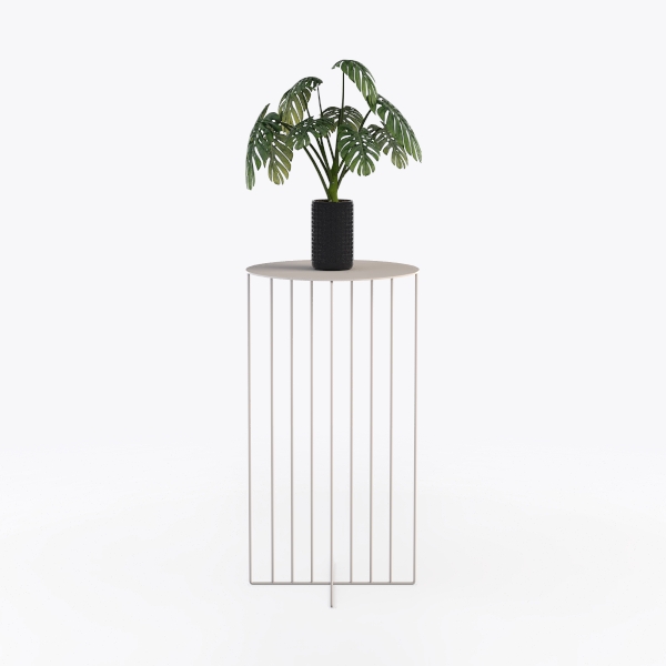 This elegant piece of furniture features a slender, geometric silhouette that blends minimalist aesthetics with organic charm. Designed to echo the harmony between structured lines and natural elements, it draws inspiration from modern interior design principles that prioritize clean forms and functional beauty. The base consists of delicate, uniformly spaced metal rods, their smooth, matte finish offering a cool, tactile contrast to the warm, rounded top surface—crafted from a light, neutral material that feels both solid and inviting to the touch. Set against a crisp white backdrop, the light-toned top and silvery framework create a sense of airiness, making it a striking yet unobtrusive addition to any space. Ideal for modern, Scandinavian, or contemporary living rooms, it shines when paired with a variety of styles—whether styled with a lush potted plant like the vibrant monstera in the image, complementing marble or wooden side tables, or standing alone as a sculptural accent next to a sofa or in a sunlit corner. The elevated design not only showcases the plant beautifully but also frees up floor space, while the stable base ensures balance. Its versatile size makes it perfect for both small apartments and larger living areas, adding height and visual interest without overwhelming the room.