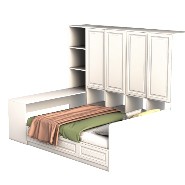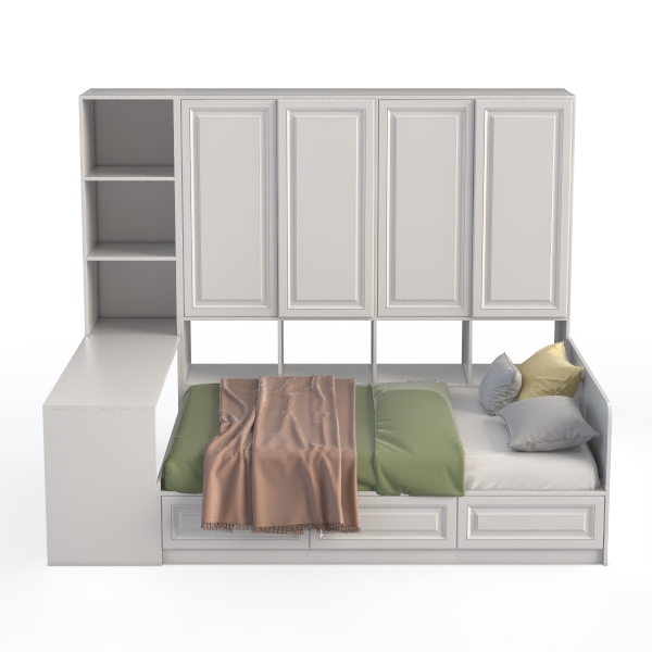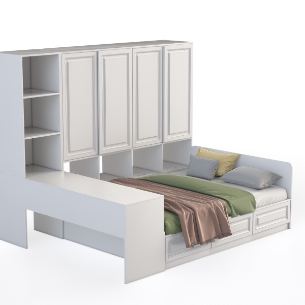 Functionality is at its core: built-in cabinets above the bed offer generous storage for clothing and linens, while the integrated desk to the side provides a compact workspace for remote work or reading. Under the bed, deep drawers add extra storage for seasonal items, ensuring the room stays organized. The padded headboard, soft and supportive, enhances comfort, making this piece not just a bed but a versatile retreat that balances style and utility effortlessly.