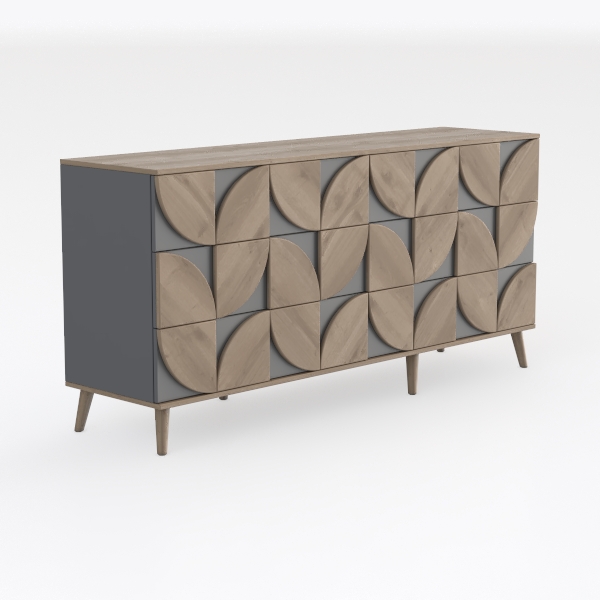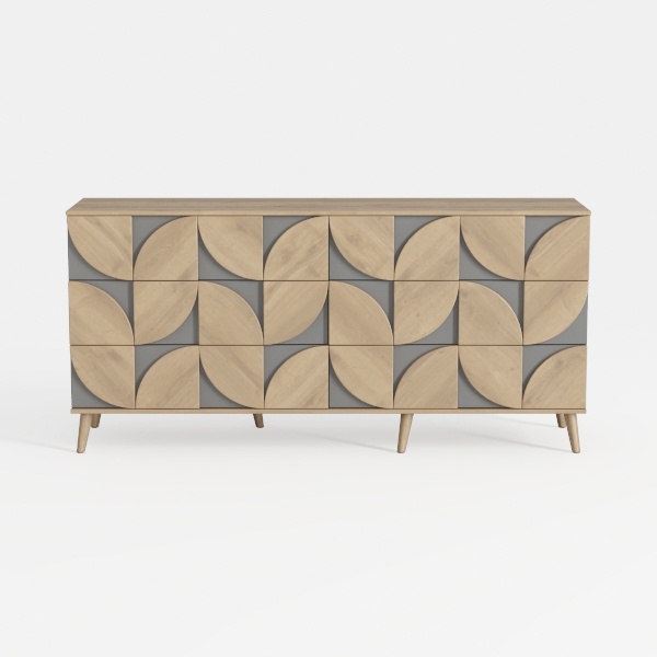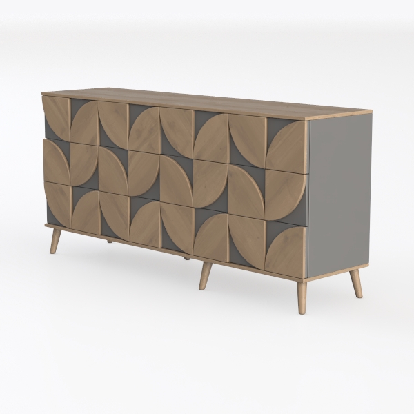 This elegant wooden cabinet draws design inspiration from the organic yet structured patterns of natural elements, blending the softness of curved forms with the precision of geometric order. Its surface features a rhythmic arrangement of light oak panels and muted gray accents, where each curved shape—resembling the gentle arc of a petal or the edge of a leaf—interlocks with angular gray squares, creating a balanced, visually engaging pattern that avoids clutter.