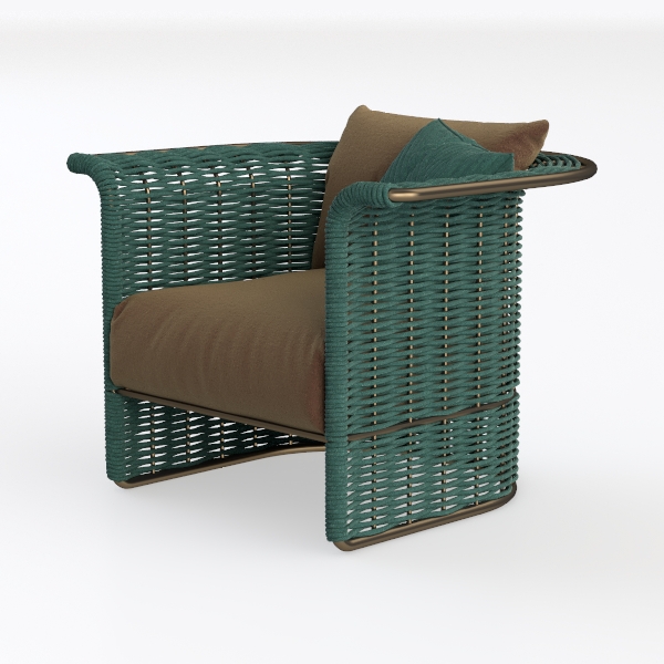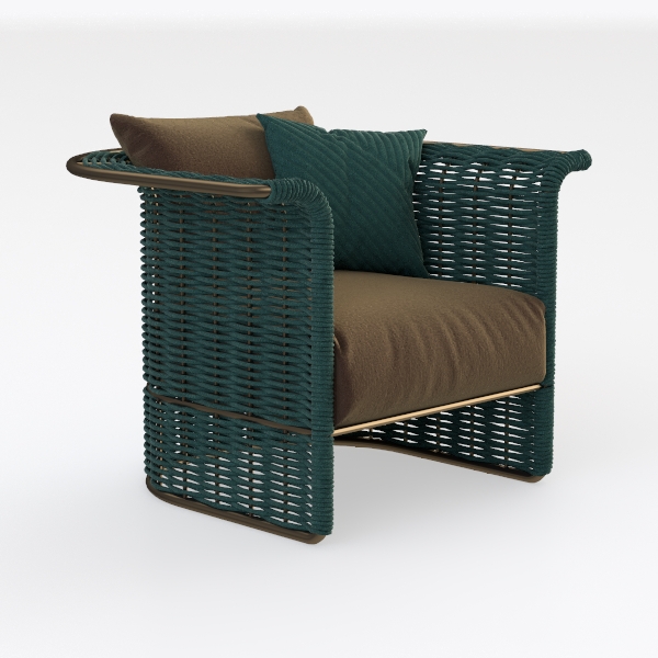 Drawing inspiration from the interplay of natural textures and mid-century design principles, this armchair merges coastal serenity with modern comfort. Its frame, crafted from a sleek, dark material, curves gently to cradle the body, while the outer edges are wrapped in a textured, woven green fabric that mimics the look of weathered rattan—light, airy, and full of organic rhythm. The seat and backrest are upholstered in a soft, warm brown fabric, its matte finish creating a subtle contrast to the vibrant green of the weaving, while a textured teal cushion with diagonal stripes adds a pop of visual interest, balancing the overall calm palette.