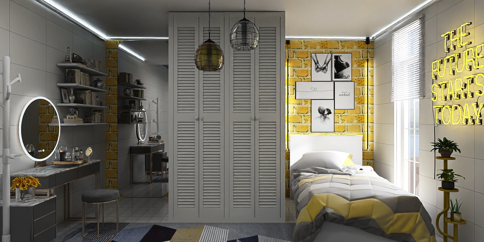 The integrated circular mirror, framed by a thin illuminated rim, casts a gentle glow, ideal for detailed tasks like makeup application. Its soft light complements the set’s warm, inviting vibe.
