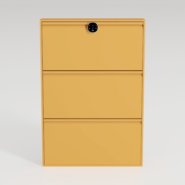 The design takes cues from the fusion of retro practicality and modern minimalism, crafting a piece that marries aesthetic charm with functional storage. Its warm amber-yellow surface, treated with a smooth, matte finish, feels surprisingly inviting—cool to the touch yet with a subtle warmth that catches light softly, avoiding harsh glare. At the top, a sleek black keypad lock adds a contemporary edge, its geometric buttons creating a striking contrast against the soft hue, elevating the piece’s visual appeal.