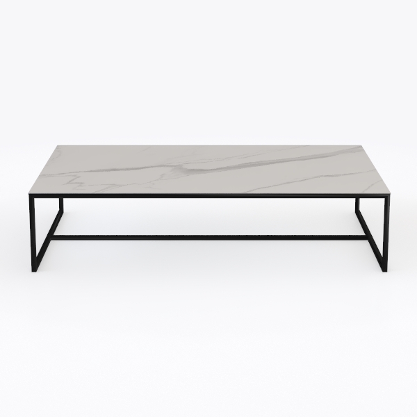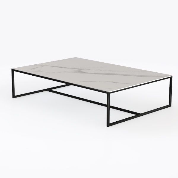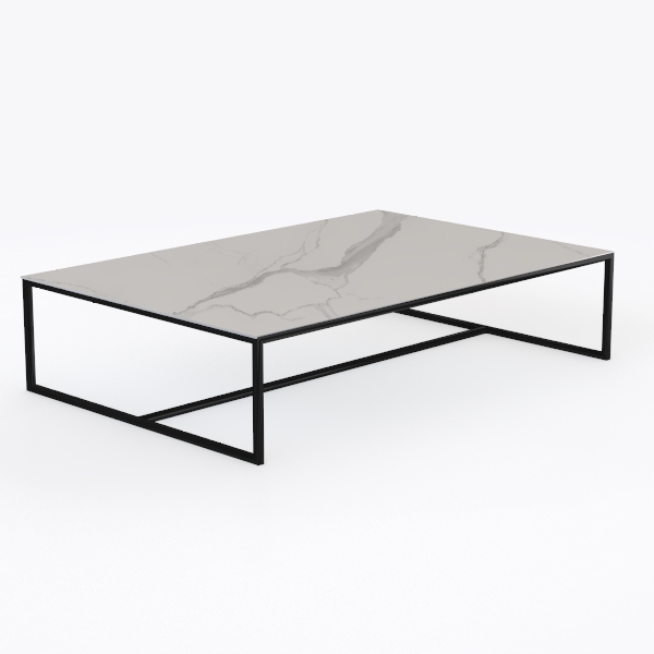 This elegant coffee table merges natural beauty with minimalist functionality, embodying a design philosophy rooted in simplicity and organic inspiration. Its top, crafted to mimic the fluid, veined patterns of natural stone, features a light gray, matte finish that catches light softly, creating a sense of calm and sophistication. The framework, formed from thin, angular black metal, adds a subtle industrial edge, balancing the warmth of the stone surface with a modern, structural presence.