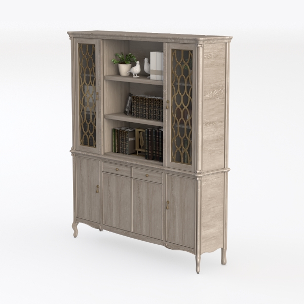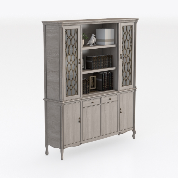This elegant piece, with its soft gray finish and intricate design details, draws inspiration from timeless furniture aesthetics reimagined for modern living. Crafted with a warm, textured wood, its surface feels smooth yet inviting, while the etched glass doors—framed with delicate, golden patterns—add a touch of vintage charm without feeling outdated. The light, muted gray hue creates an airy atmosphere, making it a versatile centerpiece that brightens any room, whether a cozy study or a sophisticated living area.