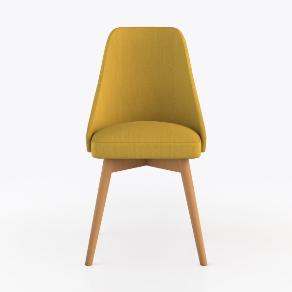 The upholstery, in a warm, sunlit yellow hue, feels surprisingly soft yet durable, with a subtle texture that catches light without overwhelming the eye. The fabric’s smoothness invites gentle contact, while the natural wood legs—with their light, honeyed finish—add a tactile contrast, their grain visible and grounding the piece in organic warmth.