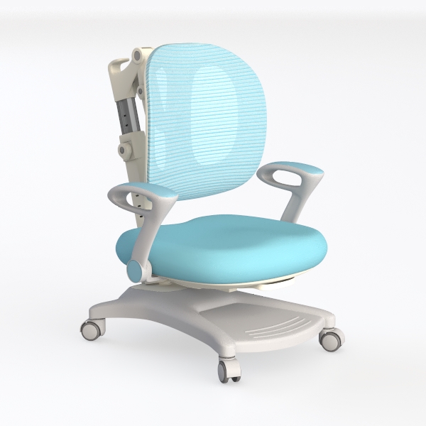 The chair’s light gray frame, with a smooth, matte finish, contrasts softly against the sky-blue upholstery of its seat and backrest. The upholstery feels surprisingly plush and resilient, offering a gentle bounce under pressure, while the backrest—curved with subtle, textured ridges—adapts to the natural curve of the spine, providing steady support. The armrests, rounded and slightly elevated, cradle the arms comfortably, enhancing the overall sense of relaxation.