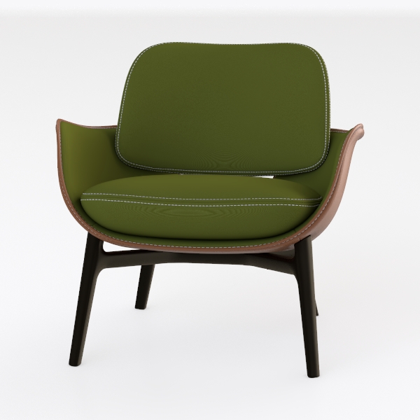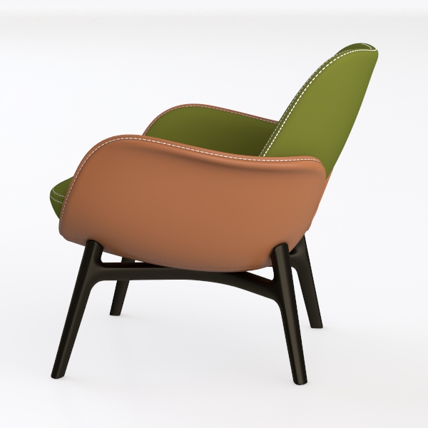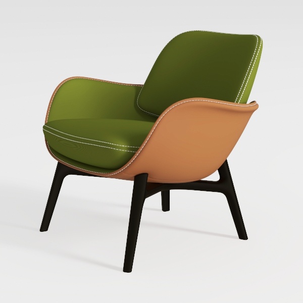 Inspired by the fluid curves of organic forms and mid-century modern minimalism, this armchair merges softness with structured elegance. The vibrant sage green seat, paired with warm terracotta backrest and armrests, creates a striking yet balanced color harmony, while delicate white topstitching traces the edges,5 adding subtle texture that catches the light. Its smooth, contoured upholstery feels surprisingly inviting to the touch—plush, high-resilience cushions cradle the body, and the generous seat depth invites relaxation, making it ideal for long evenings of reading or casual chats. The sleek black wooden legs, angled slightly for stability, ground the piece, balancing its rounded silhouette with a grounded presence.