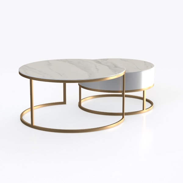 The table tops feature a smooth, glossy finish in soft white with delicate, flowing veining, offering a cool, tactile contrast to the warm, polished gold metal framework. The metal base, formed into two concentric circles, creates a sense of lightness and stability, allowing the entire piece to feel both substantial and airy.